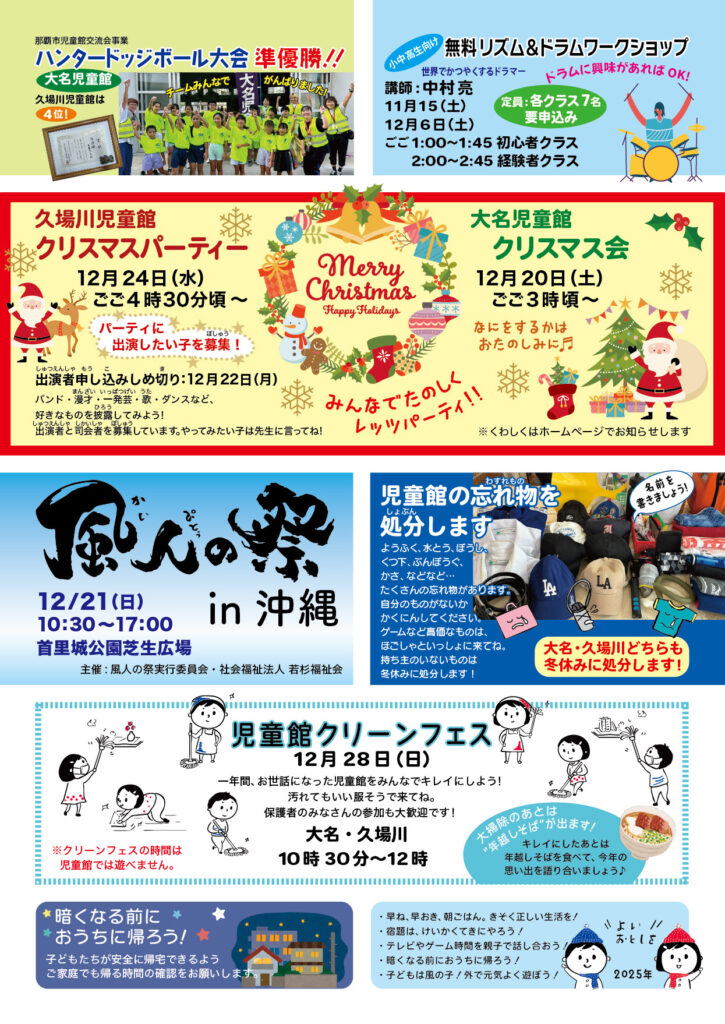 11、12月は、初心者でも基礎から教えてもらえる「ドラムワークショップ(大名)」やクリスマス会、一年間たくさん遊んだ児童館の大掃除などがあります。