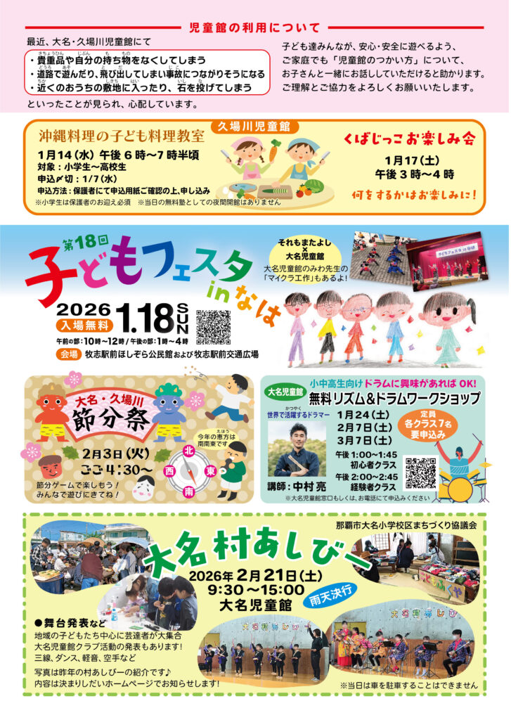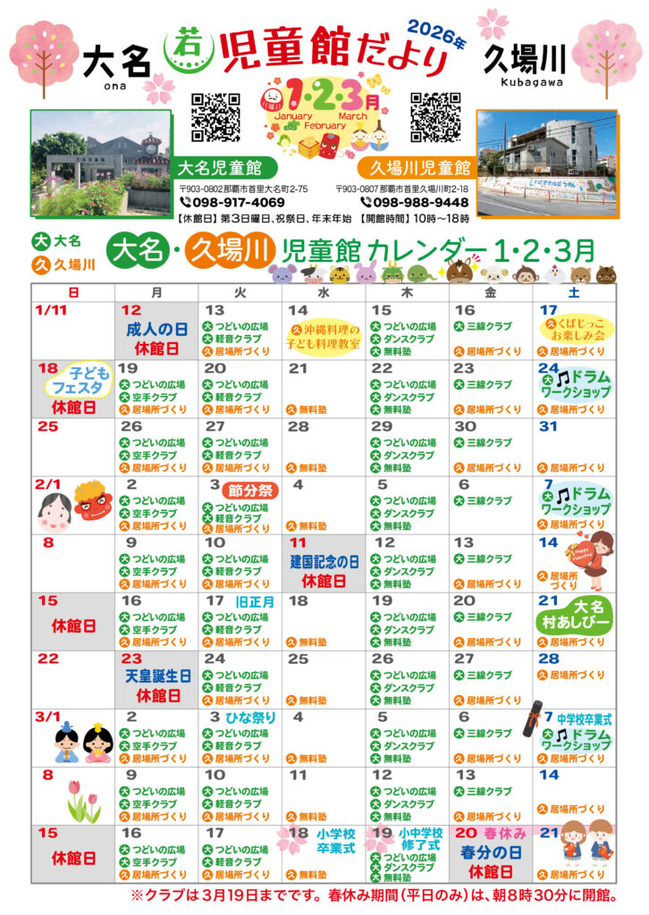 館だより 1、2、3月号 2026 1/06 久場川児童館 児童館だより 2026年1月6日 2026年も、子ども達みんなが楽しく過ごせる児童館であるよう職員一同努めていきたいと思います。今年もよろしくお願いいたします。 1〜3月をまとめた今年度最後の館だよりとなります。行事等の詳細は各児童館にお問い合わせください。 久場川児童館 児童館だより new 久場川児童館 児童館だより よかったらシェアしてね! 関連記事 沖縄料理の子ども料理教室 2026年1月5日 忘れ物を処分します! 2025年12月1日 1月の休館日 2025年12月1日 11/25は通常開館します 2025年11月25日 11、12月館だより 2025年11月4日 ライブコンサートへご招待します♬ 2025年10月6日 ここからユースカフェ in 久場川児童館 2025年9月16日 9、10月館だより 2025年9月12日